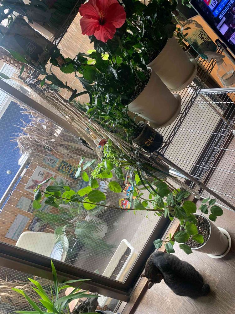 我が家のハイビスカス🌺も元気に咲いてるしベランダで豆をぶつけられてもまだ出たいプア🐈🐾ちゃんとのコラボです☺️