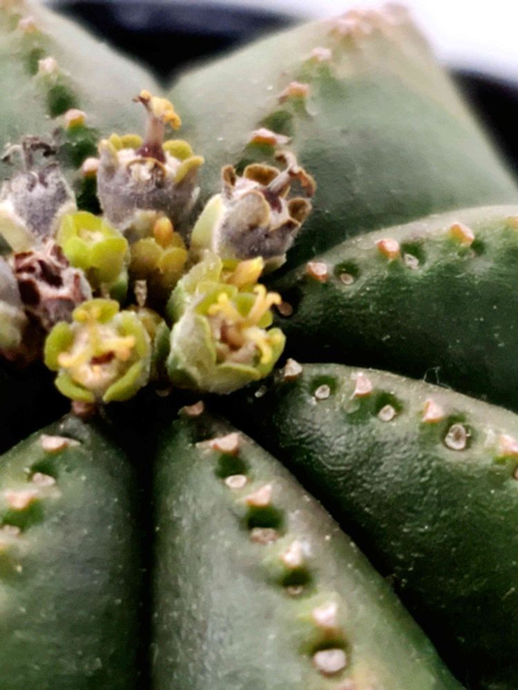 さん、これが花ですよ!ユーフォルビア属は地味なんです。そして、♂️が居ないので、今は受粉結実しません😢