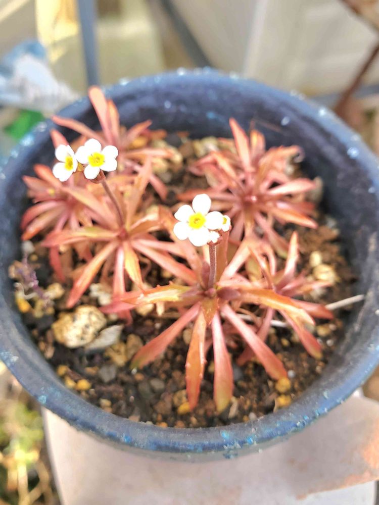 たぶんアンドロサセ スターダストの溢れたねから生えたものだと思うけど葉が紅葉して可愛いお花までこの時期に咲いて愛おしいです😆💕💕