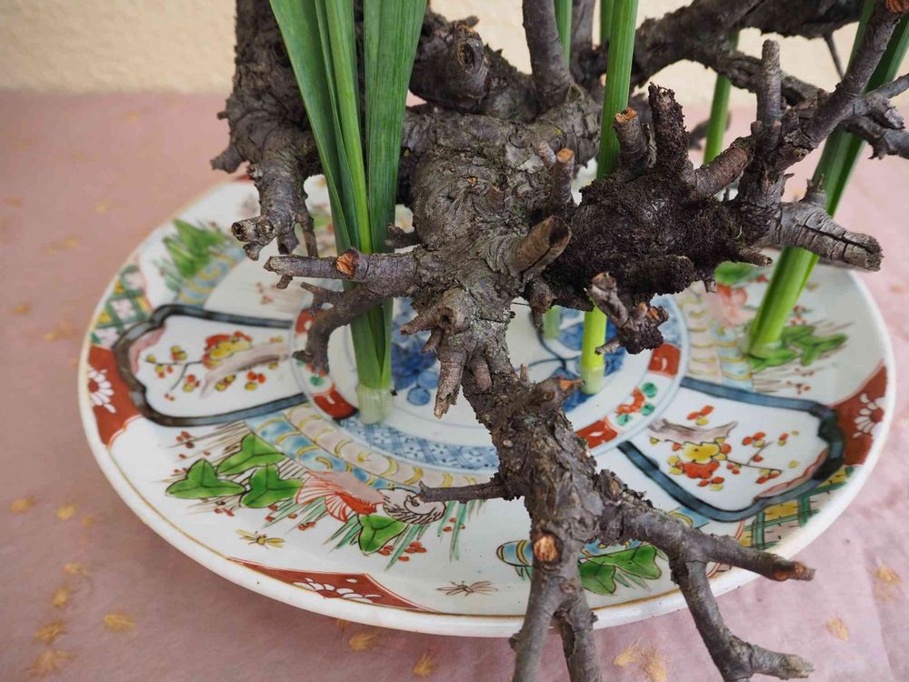 素敵なお皿に古木を置かれ、水仙が生けてありますね✨