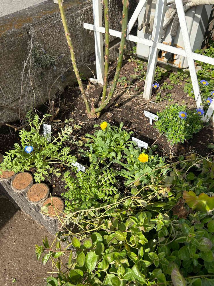 奥が青いフェリシアベリシア、手前の黄色い花がムールチコーレ、一番手前がひたち海浜公園で有名なネモフィラです。ムールチコーレだけは一年草です。