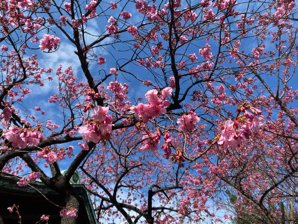 とても大きい寒緋桜が満開でした。北品川の荏原神社にて。