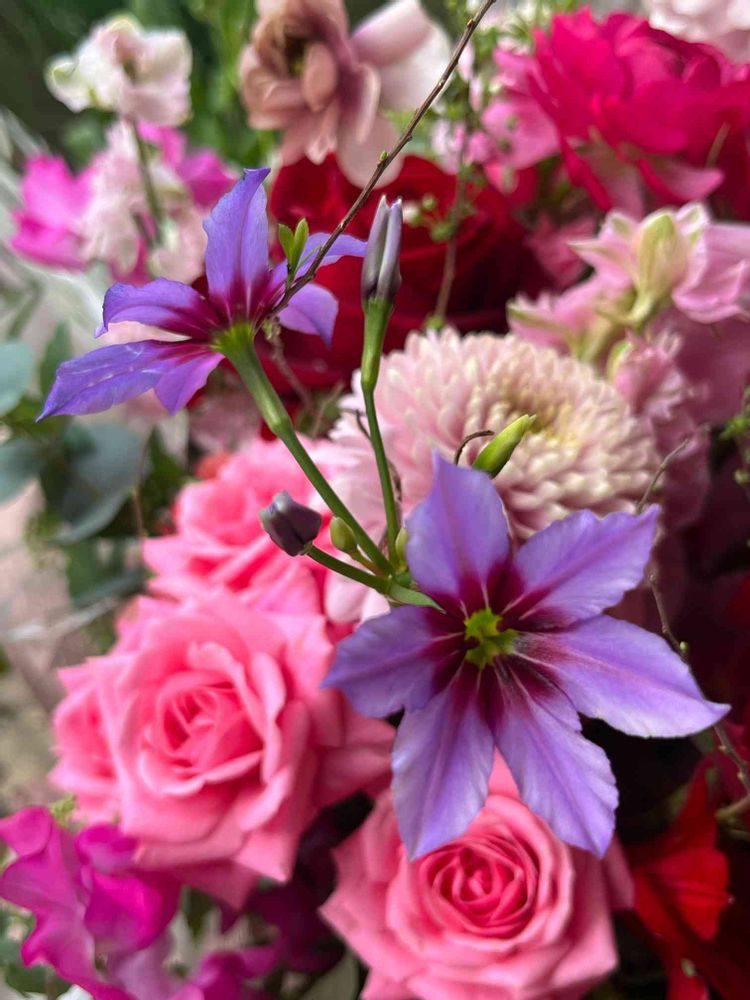 いただいたアレンジ花の中でひときわキレイなこのお花は何という名前かな?わかる方いたらおしえてください!🙏→リューココリネと教えていただきました〜 ありがとうございます🙇♀️まだまだ知らないお花がアレンジの中にあるので、また教えてください!