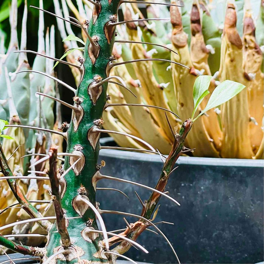 絵の具のような濃い緑、バラの枝みたいにトゲトゲ😆ちょっと太い鉛筆サイズだけど大切に育てて、ボケる頃にはチクワサイズくらいになるかなぁ😅植物🪴と気長に暮らしていきたいです♪
