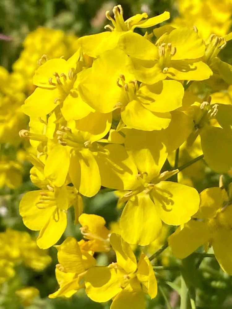 菜の花はほぼ満開で花粉だらけになりました 花言葉は「快活な愛、活発」