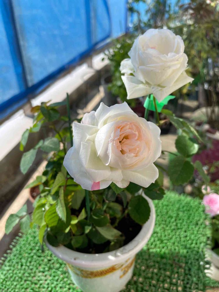2/6 新入りの白バラ「やばしら」(鉢の名前)💕2輪目も美しー😍絞りのピンクが出ました❣️