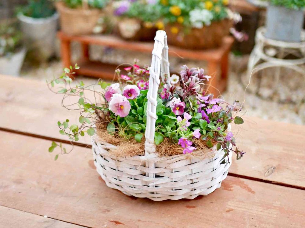 白いバスケット。ピンク色のお花とリーフで可愛らしい寄せ植え出来ました😊