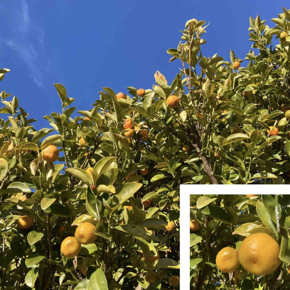 お散歩中。大きな木にたくさんなってました。鳥さん、食べないのかなぁ?青空に、檸檬色(金柑色?)が映えて。💛💛💛