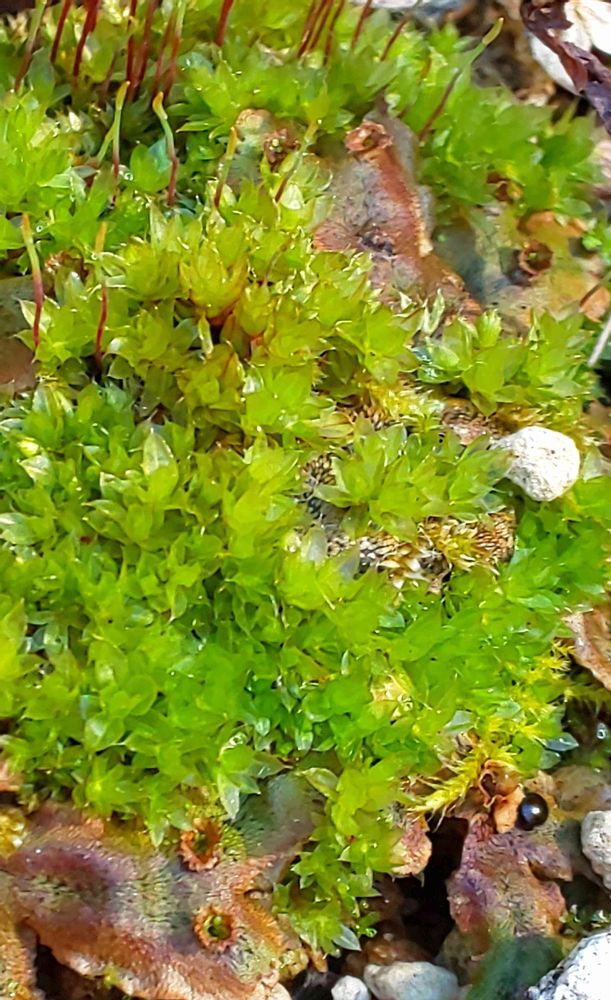 下の方で赤茶色になったゼニゴケが緑の眼をして狙っています 👽️