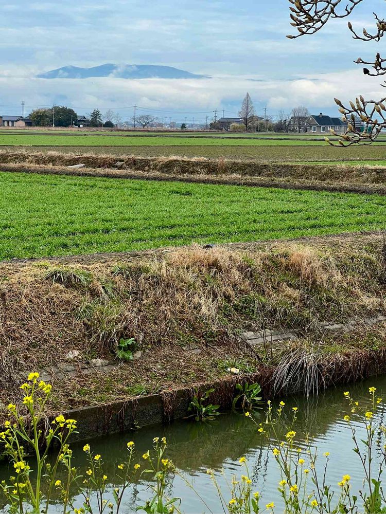 田んぼに遠くの山には雲がかかって素敵な写真です、、