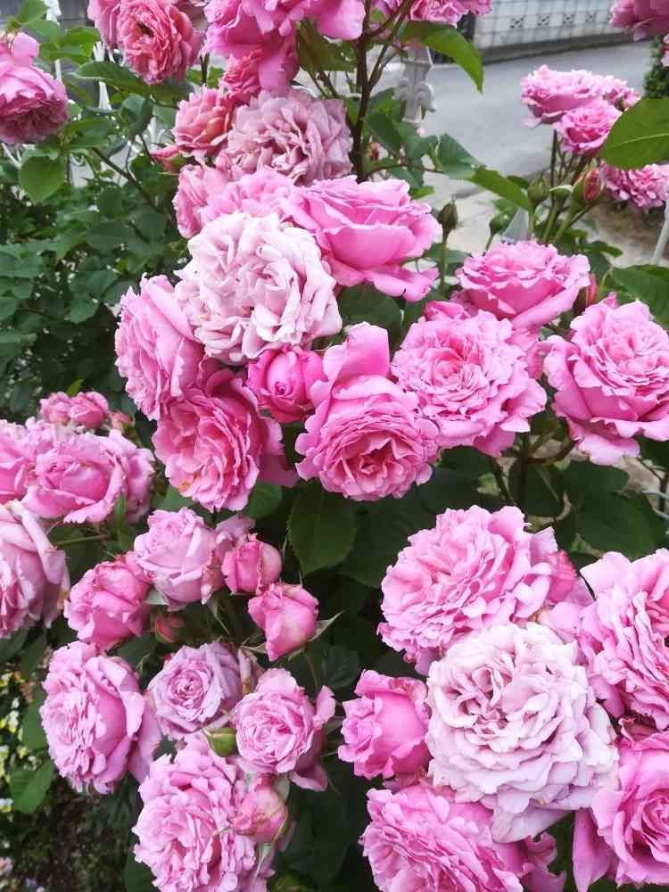 こんなに咲くとビアンヴニュは華やかで良いですね。つるバラ扱いで剪定したのですが、デルバールのバラは派手な印象。切り詰めてもうちょっと足元近くで咲かせたほうが良かったのかも。