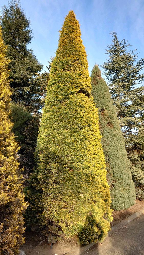 プレートにはイトスギ「ゴールデンクレスト」と表示されていました🧐 西日を浴びて金色に輝いていました✨ あっ、怪しい人影が! すんません🫢、撮影しているわたくしめです📸🫣