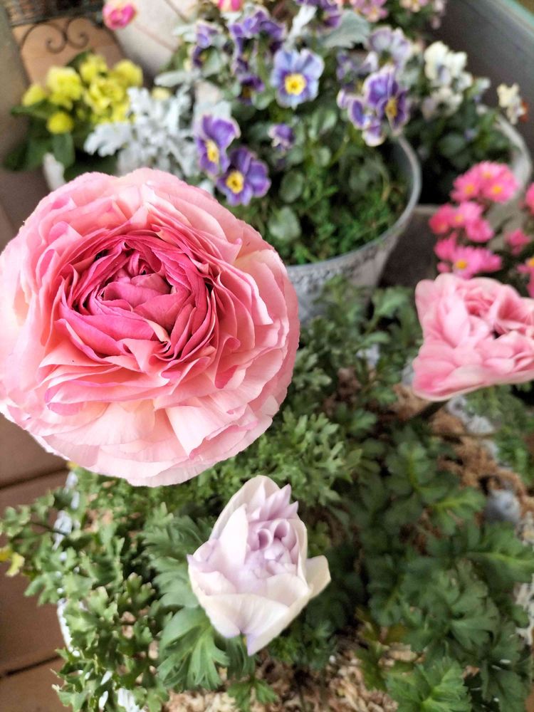 ラナンキュラスセレンディ、アネモネダブルパステル、アネモネ八重を一緒の鉢に✨