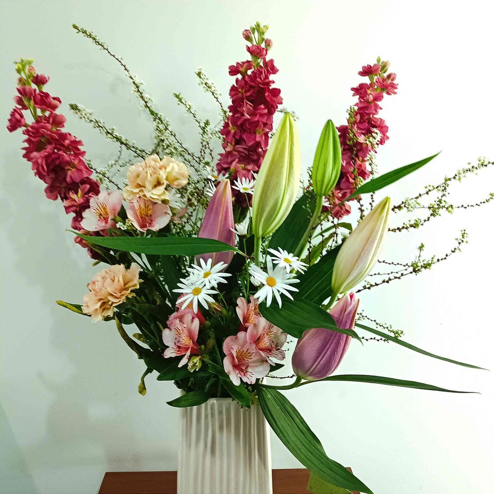 今週の花材は、ストック、百合、カーネーション、マーガレット、雪柳、アルストロメリア✨です