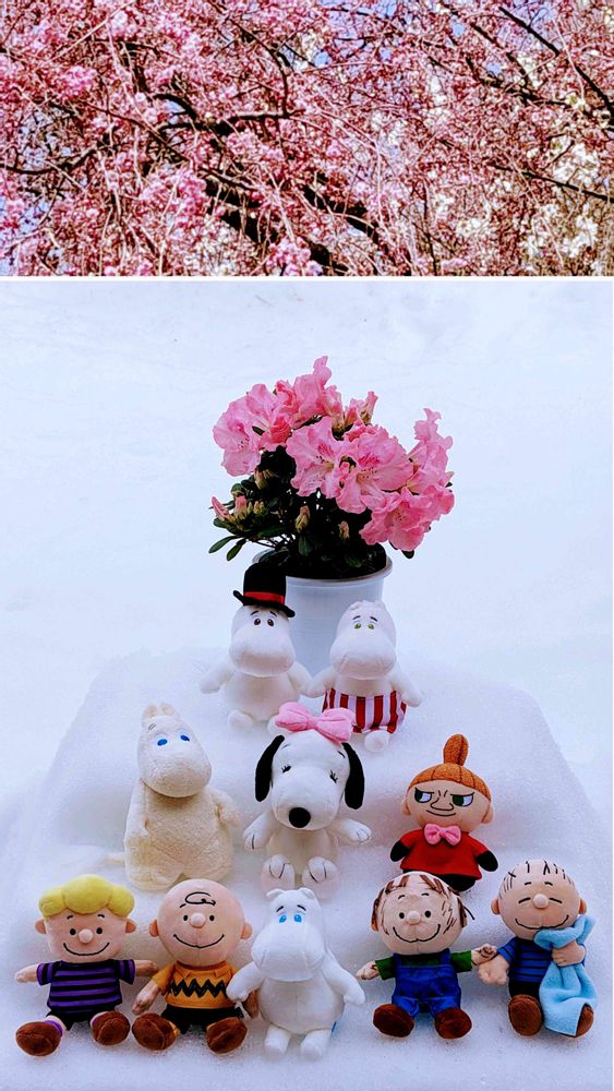 去年の4月の桜を背景にアザレア➕ムーミン谷の仲間たち➕PEANUTS仲間
