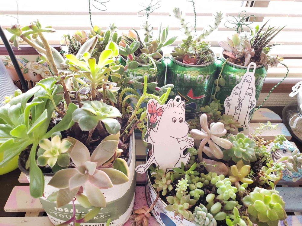 わぁ、多肉畑でムーミンとニョロニョロが楽しそうに遊んでますねー