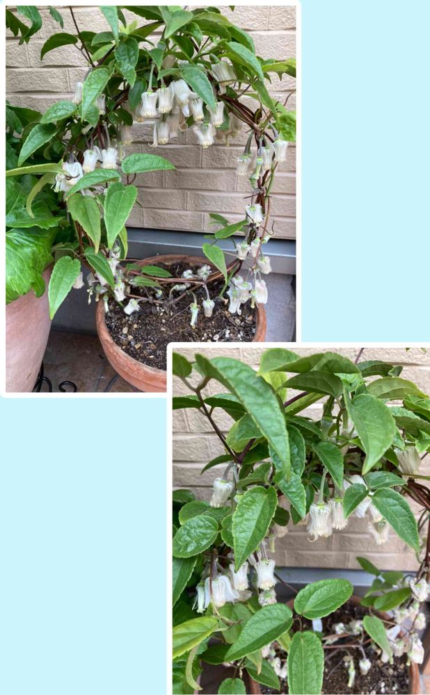 冬咲きのクレマチスでしょうか。ベル型の白い花がいっぱい垂れ下がってました。