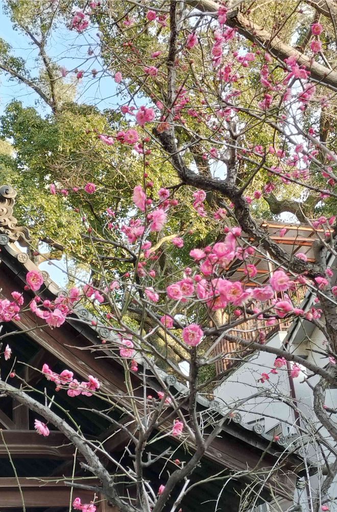 買い物がてらぶら〜っと近くの神社⛩に立ち寄ったら、未だ咲き残りの梅の花🌸が・・空たか〜く✌️😍