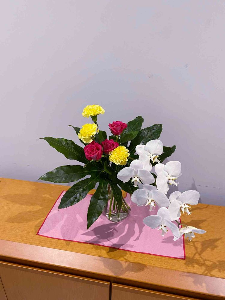 ピンク・黄・緑という色のハッキリした花材に、垂れ姿がきれいな白い胡蝶蘭を合わせてみました。
