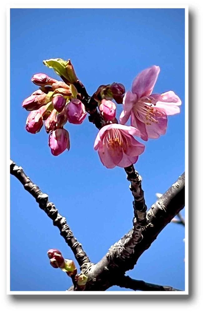 📝いつものデンタル・クリニックの庭に河津桜がニ分咲きくらいで咲いています。
