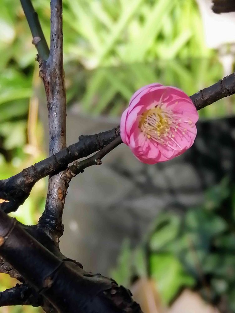 ちょこさんの投稿で、地面に下ろした盆栽の梅🌺