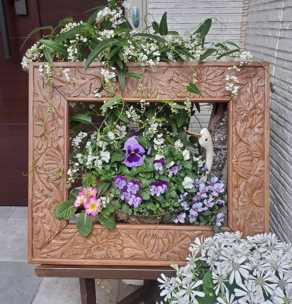 額を塗り直しパンジービオラを植えやっと玄関に冬から春へのバージョンになりそうかなぁ……