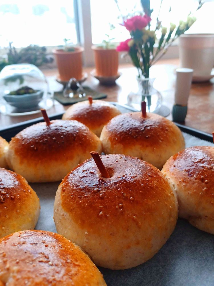暖かい部屋でリンゴパンとお花にかこまれて、、、