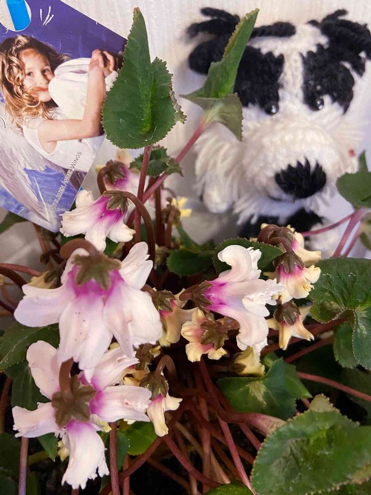 今日はニットの日‥というのを初めて知りました。なので5年前に天使になったボーダーコリーの愛犬ジャックの手作りニットと花が増えてきた天使のはねのシクラメンをコラボしてみた🎶🙏💕