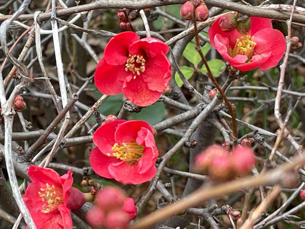 縦横無尽に張り巡らされた、枯れ色の枝の間にたくさんの木瓜の花🌸