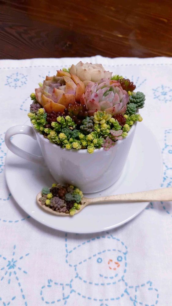 ジュンさんの窓辺,多肉植物寄せ植え,カップに寄せ植えの投稿画像