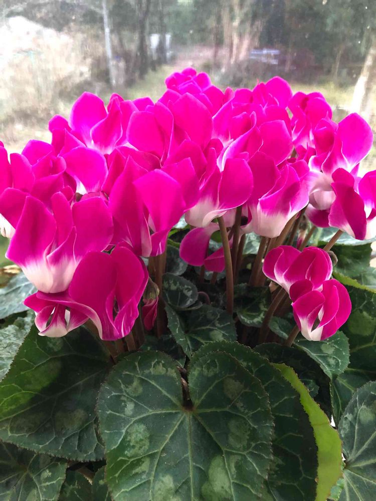鮮やかな色と白とピンクのグラデーションが美しいシクラメンです。