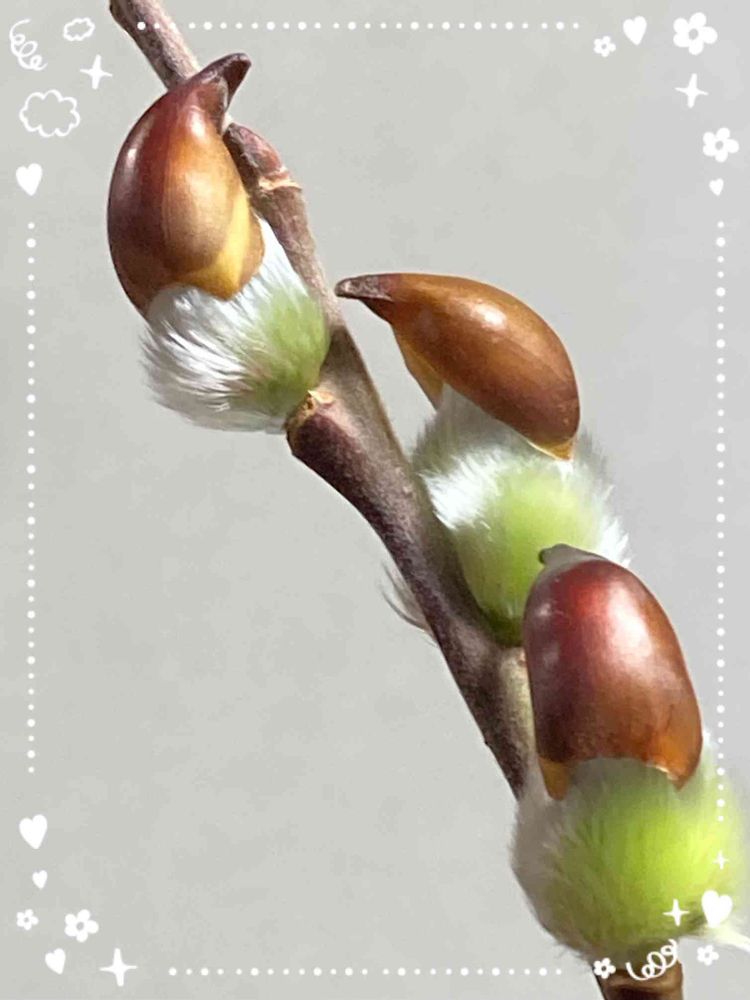 ヨイショ、ヨイショ…ネコヤナギが冬用コートを🧥脱ごうとしています😊