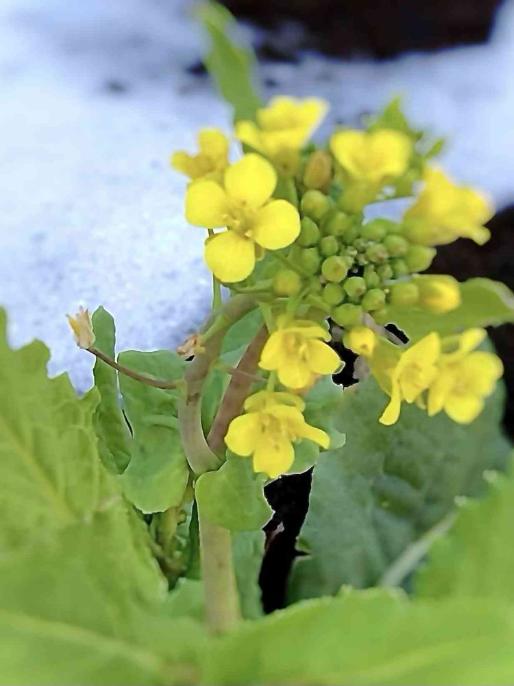 雪の中の菜の花🌼逞しいなぁ( ˊᵕˋ* )💛