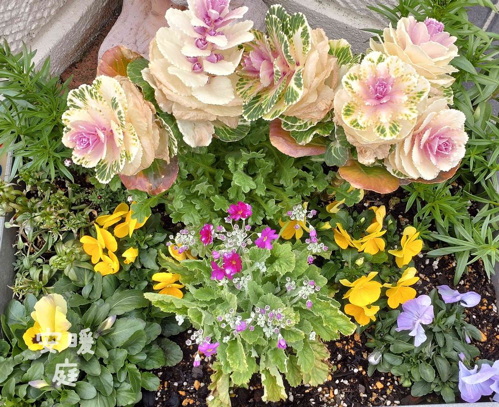 パンビオやマラコイデス、リナリアなどが咲き揃う前にハボタンが踊る準備に入った様子😂
