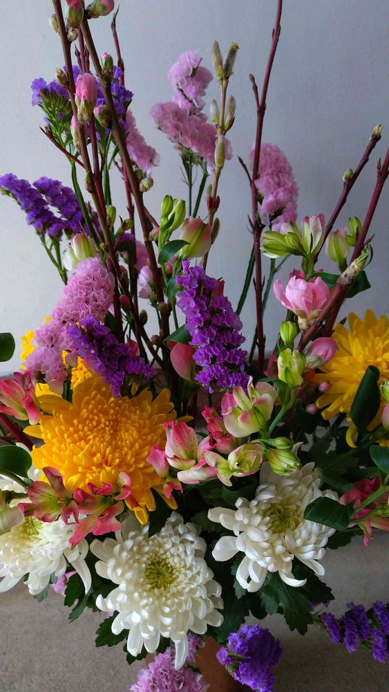 🌿💜💗💛桃の花・ネコヤナギ・スターチス・アルストメリア・菊💛💗💜🌿