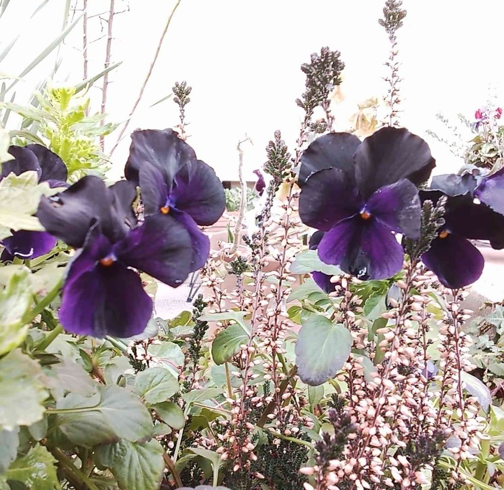 ハロウィンの季節に黒色のビオラとカルーナとかで寄せ植えしてたのが今 紫色に変わってきましたよ 日が当たるとさらにきれいに見えますよ✨🎶