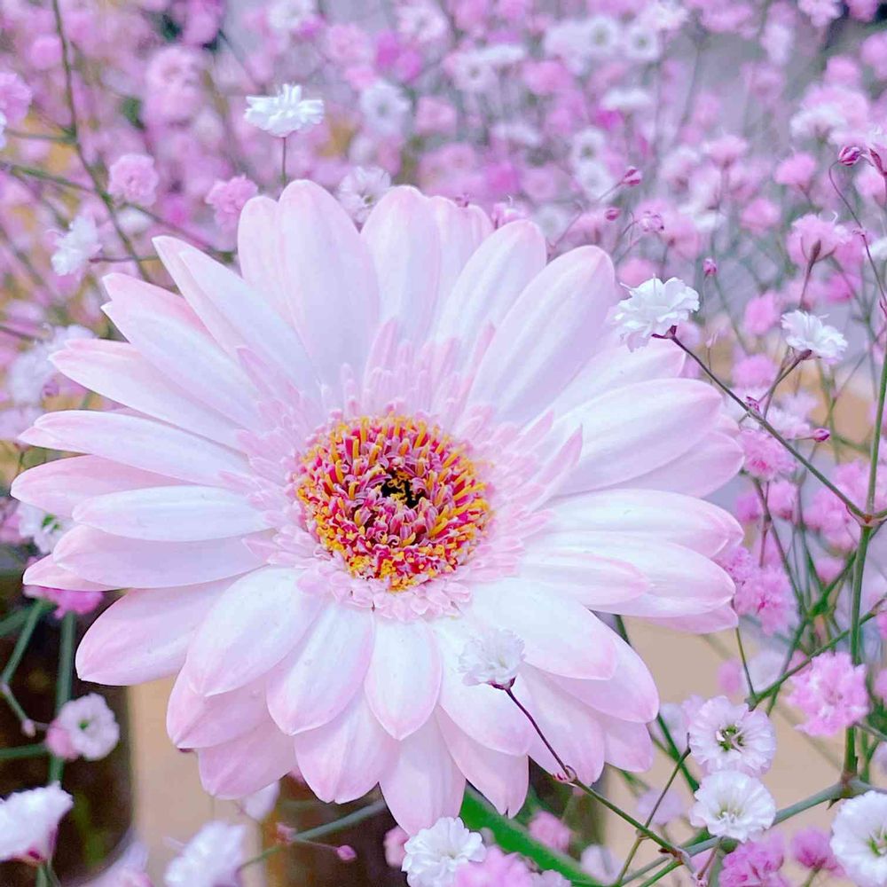 たくさんのかすみ草の中にさりげなく咲くお花たちが可憐でした(^^)