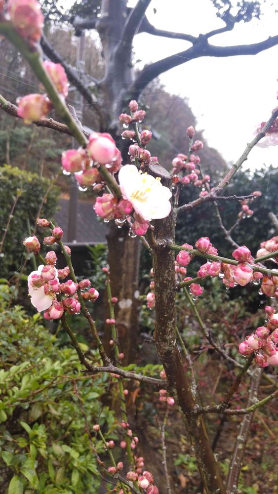 雨の中ピンクの梅のお花が咲き出し春近しです。