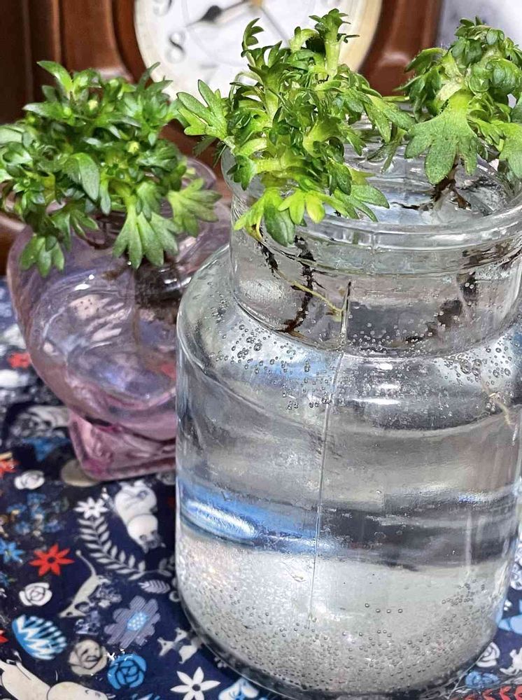 このまま植えても私のお世話では多分蒸れですぐさよならになりそうなので思い切って土を洗い落として白い根っこが付いてる子だけを水あげした写真です😄