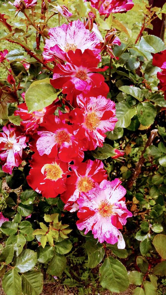 赤色に白のストライプ模様と、黄色の花芯がとても鮮やかな色合いのクライミングローズです。