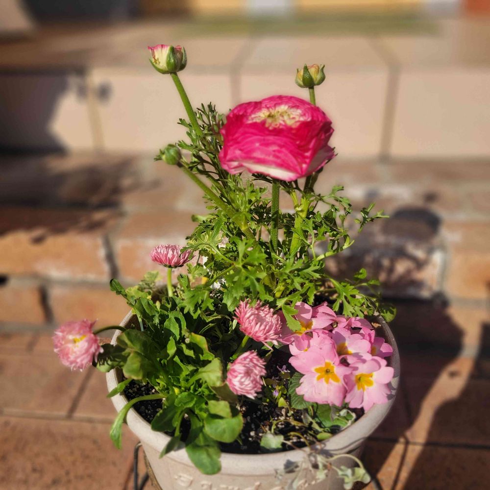 ラナンキュラスの寄せ植え…デージーとジュリアンもピンクで💗ナツメグゼラニウム、種からビオラ、こぼれ種のイオノプシジウムも植えてます。