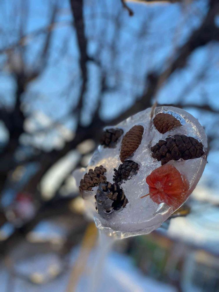 氷点下❄️秋に拾った松ぼっくりを使って氷を作りました♪寒いけれど楽しい♬