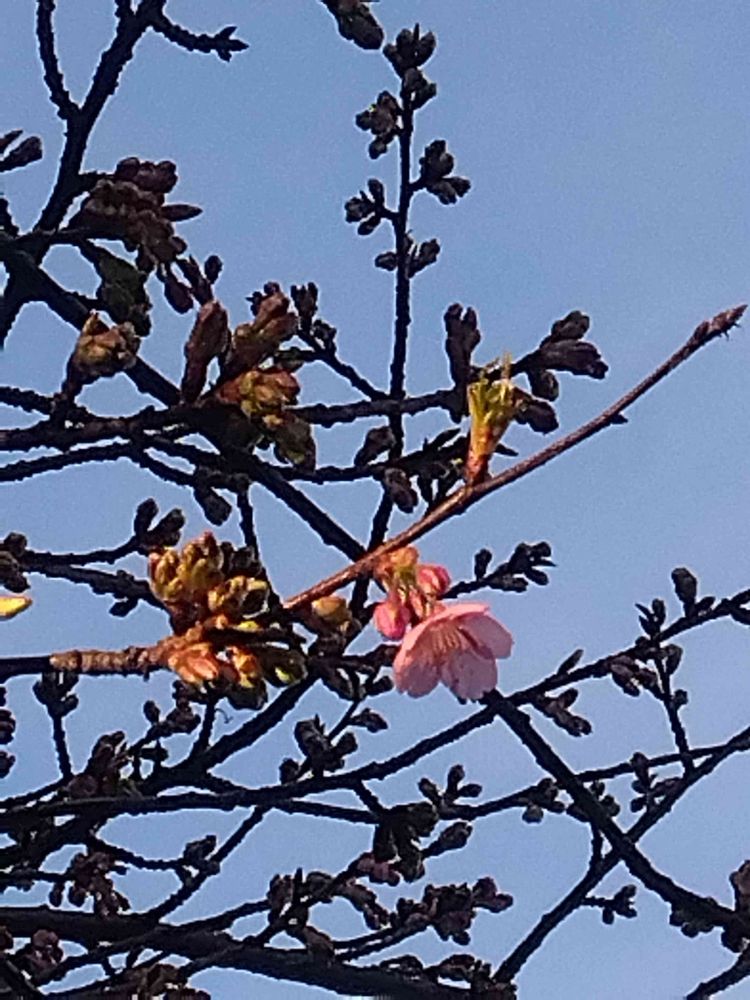 氷川神社の河津桜🌸 一輪咲きましたネ🎶 今週末の暖かさで 一気に咲きますヨ🌸🌸🌸🌸🌸