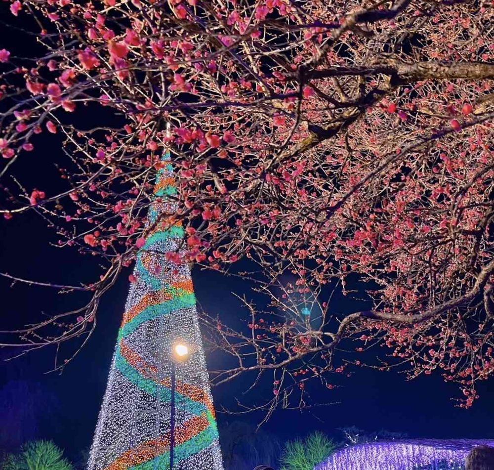 足利フラワーパークのイルミネーションと共に咲く寒紅梅です(1月撮影)