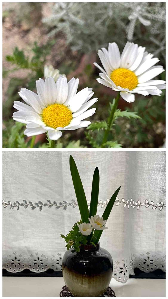 全体のバランスからだと、葉が3本では強いので(太い)形や、葉をそのまま使うなら2本でいいと思います。ノースポールの咲いているものを、高さの違うものを5本くらい入れても、安定した器なので、しっくり見えるはずです。