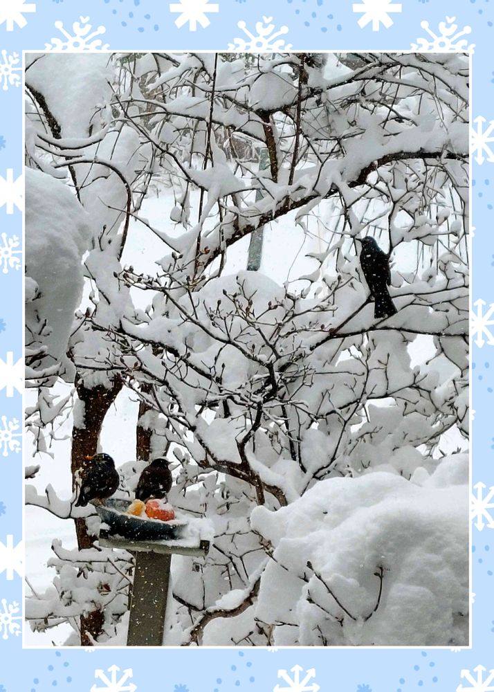 鳥さん達も、食べ物を探すのに、一苦労ですね。こんなふうに果物🍊🍎を貰えたら、嬉しいでしょう。笠地蔵じゃないけど、明日の朝、何が素敵なものが届くかもしれませんね。