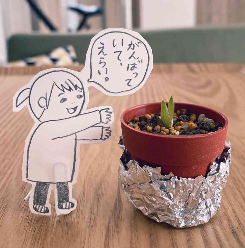 写真は、いつも真面目に撮るのですが、今日はふざけて私の絵を描いて苗の隣に置きました。前にハオルチアオブツーサにベヌスタを受粉させて二つだけできた種を植えたものがちょっとずつ大きくなってきて、最近三つめの葉っぱを出そうとしています。早く大きくなって、お父さん似かお母さん似か見せてほしいです。