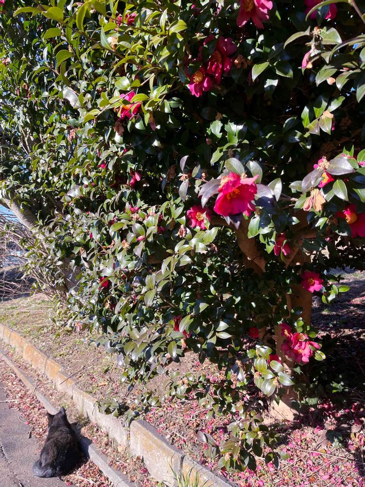 猫と椿(ではなくサザンカ!)。寒い1日の中でも、明るい日差しにほっこりできたお昼時です。