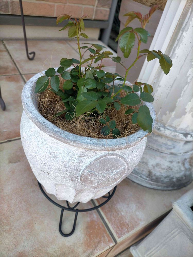 ハチさんの鉢にミニバラを植えてみました ·͜·
