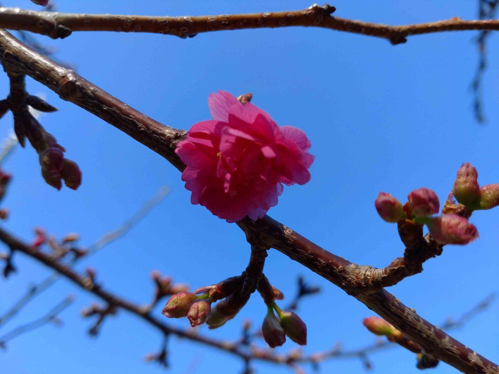 抜けるような青空と、鮮やかな躑躅色の八重咲きの桜のコントラストは最高だね😆